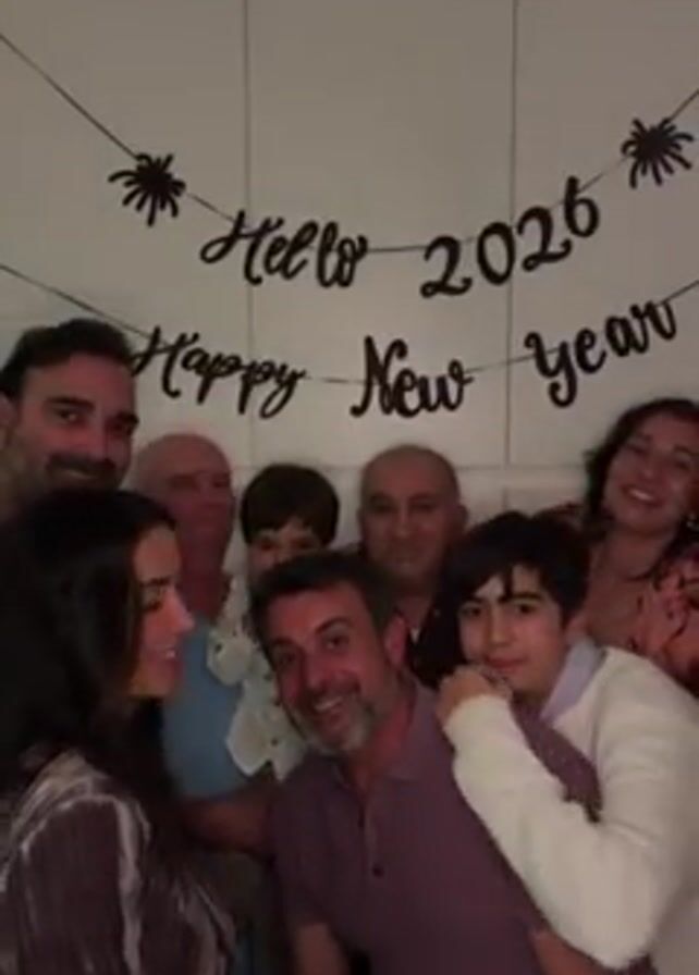 A group of eight people of varying ages are gathered closely together, posing for a photo. They are indoors, standing in front of a white wall decorated with a black banner that reads "Hello 2026 Happy New Year" and features spider accents on either side. The people are all smiling or looking at the camera. Their clothing styles range from casual shirts to patterned tops. The lighting is moderate and evenly distributed. The focus is primarily on the people and the banner.