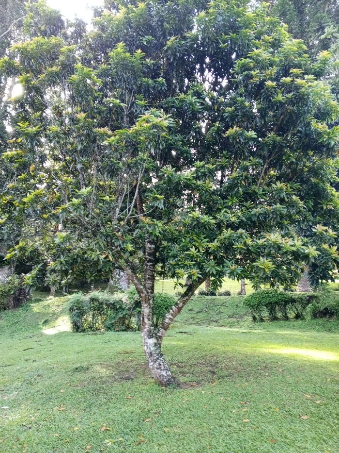 A lush, green tree dominates the frame, its leaves a vibrant mix of green and pale yellow. The tree stands in a well-manicured lawn, the grass short and evenly cut. Beyond the tree, trimmed hedges line the area, adding to the orderly appearance. The tree's trunk is light-colored and marked with patterns. Sunlight filters through the foliage, creating bright patches on the grass. The overall scene is one of tranquility and natural beauty.