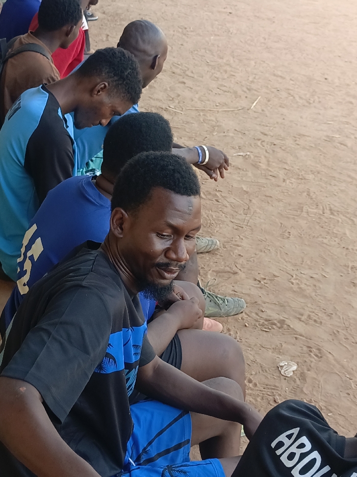 The scene captures at least six Black adult males seated outdoors in Akwanga, Nigeria. They are arranged in a row, facing right from the viewer's perspective, on a low structure or directly on the ground. The environment consists of light brown, dusty bare earth or sand. In the immediate foreground, a male with short dark hair, a short beard, and a distinct mark on his forehead is visible. He wears a black short-sleeved shirt with blue patterns (possibly palm trees) and blue patterned shorts, exhibiting a slight smile and looking downwards to his right. His left arm rests on his bent left knee. Immediately behind him, another male is partially visible, wearing a blue short-sleeved shirt and dark shorts. Further back, a male in a light blue and black short-sleeved shirt looks downwards, followed by a bald male in a light blue shirt, seen from behind. Two more males are partially visible behind him: one in a brown shirt with a backpack, and another in a red shirt. One individual's wrist, positioned between the foreground subject and the person behind him, displays a white and blue wristband. The feet of some individuals, wearing green or light-colored athletic shoes, are visible on the dusty ground. A small, crumpled, light-colored object lies on the ground to the right. The black shorts of a person seated to the far right, partially out of frame, display the white text "ABDUL".