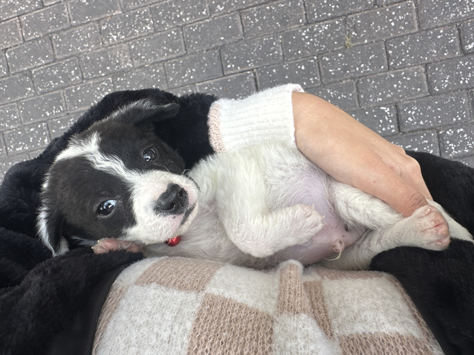A small, black and white puppy is held in someone's arms. The puppy has a red collar and is mostly white on its belly and legs, with black fur on its head and back. The person's arm is visible, and they are wearing a light-colored knitted sweater. The puppy is lying on its back, looking up at the camera. The background is a gray brick surface. The puppy appears relaxed and comfortable in the person's arms.