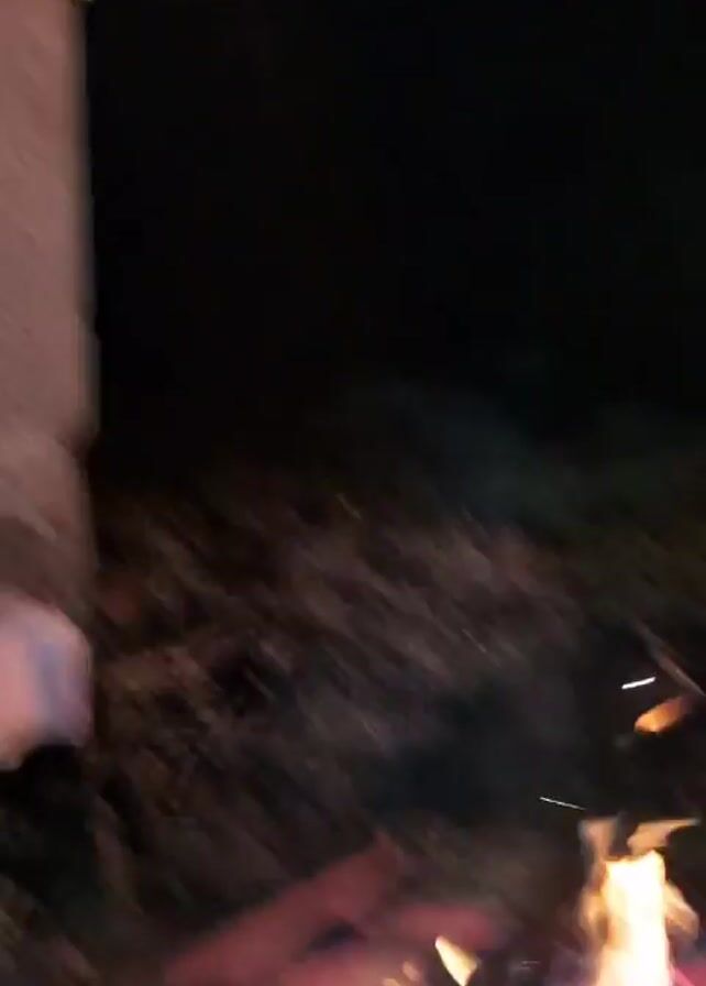 The video starts with a campfire burning brightly, logs ablaze, embers glowing