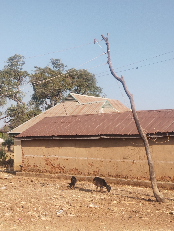 A rural scene shows a brown, weathered building with a corrugated metal roof under a clear blue sky. Two goats, one larger and one smaller, graze on the dry, sparse ground in front of the building. A bare tree trunk stands at the right, while power lines are strung overhead, with a bird perched on the wooden pole. Trees with green foliage are visible in the background, adding depth to the landscape.