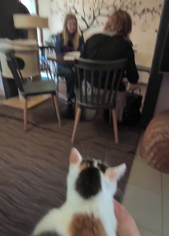 interior of what appears to be a cat cafe. The scene is taken from the perspective of someone holding a calico cat. In the foreground, the back of the cat is visible, showing its white, brown, and black fur. Two women are seated at a table in the background, engaging in conversation. One is blonde, and the other has red hair. The room is decorated with a tree mural, and there are cat trees and other cat-friendly furniture scattered around. The cafe has a mix of tiled and carpeted flooring. The focus shifts to a woven cat bed and a cat tree with a hanging hammock. The video gives the impression of a cozy and welcoming environment designed for both humans and cats.