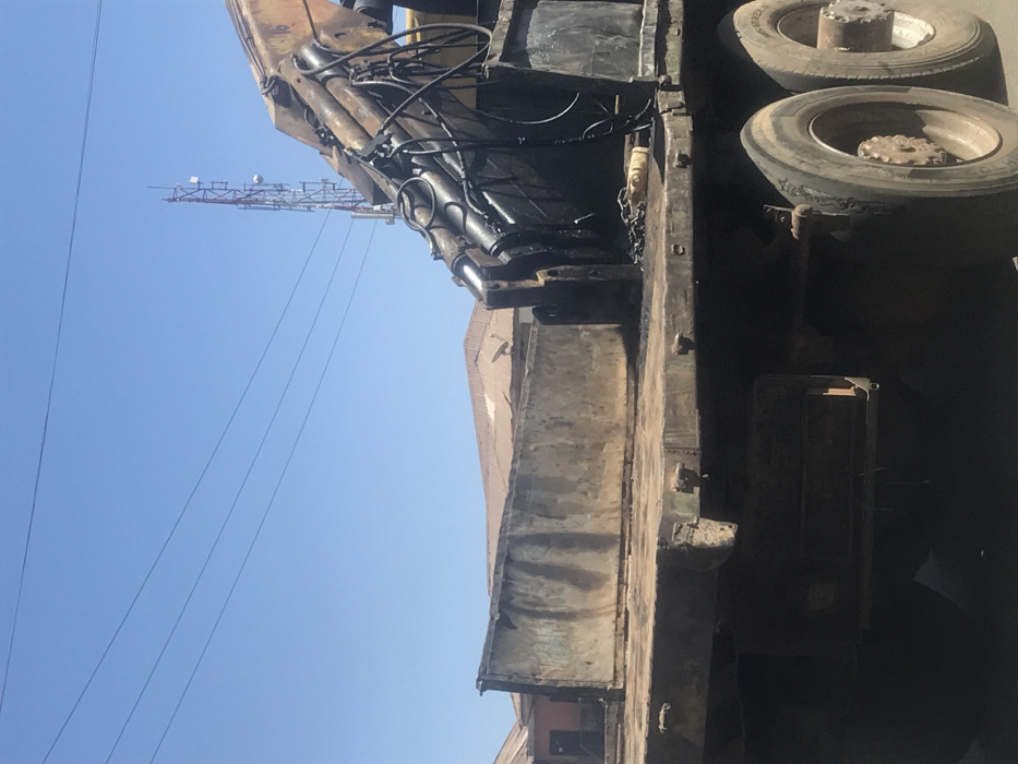 A partially visible crane rests on a flatbed truck with two visible tires