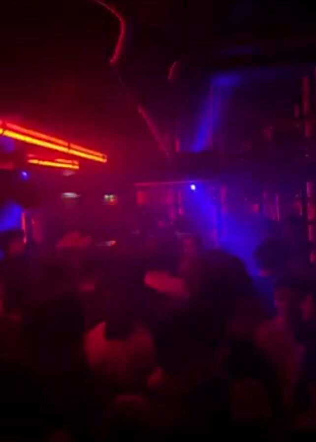crowded nightclub with people dancing. The lighting is dark, with strong red and blue spotlights illuminating the scene. A bar area is visible in the background. People are mostly silhouetted and difficult to identify individually.