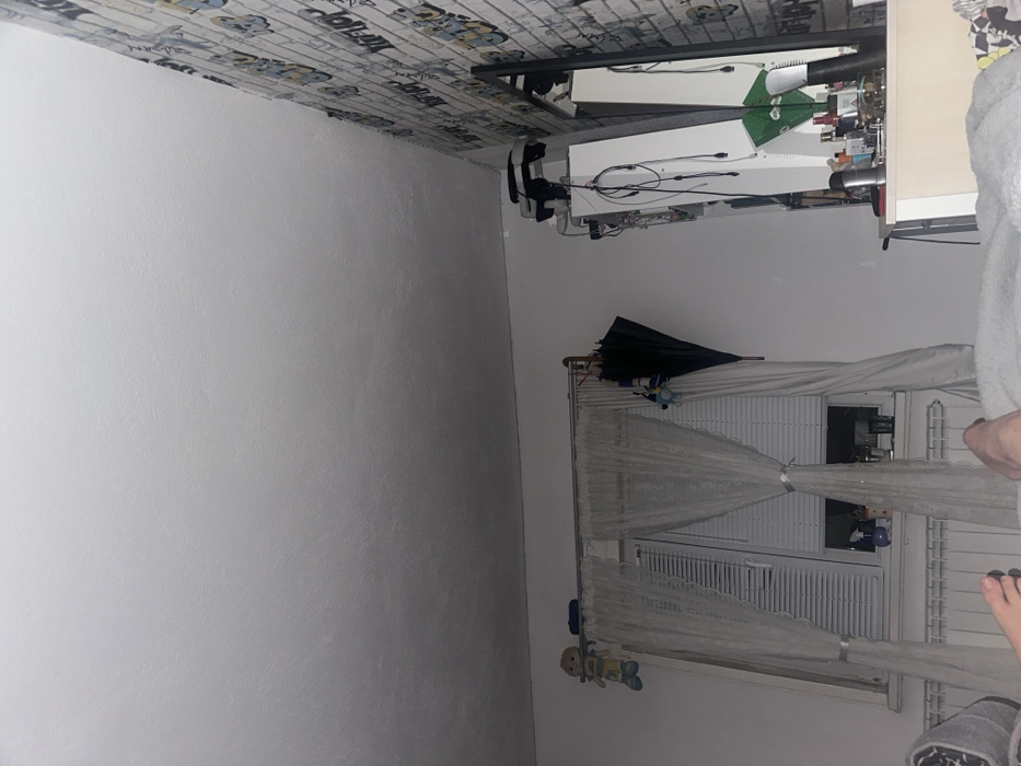 The image captures an interior room in General Toshevo, Bulgaria, observed from a low vantage point, likely from a prone position. The upper half of the frame displays a white, textured ceiling. The left and rear walls are painted white, while the right wall features light-colored wallpaper with a repeating pattern resembling brick blocks and stylized text, possibly "YoFOH". In the left-center, a rectangular window is visible, fitted with white horizontal blinds. Two sheer, white lace curtain panels, each tied back in the middle with a light-colored ribbon, frame the window. A metallic curtain rod extends above the window. Attached to the left side of the rod is a plush toy, yellow and blue in color, hanging by its arms. On the right side of the rod, a black, open, inverted umbrella is suspended, alongside a smaller plush charm. Below the window, a white finned radiator is installed. The window sill contains several small bottles and glasses. On the right side of the room, a tall, white furniture unit, appearing to be a dresser or shelving unit, stands against the patterned wall. A black-framed mirror is affixed to or leaning against its right side. On the top surface of this unit, a white virtual reality (VR) headset is visible. Multiple black and white cables hang from the side of the unit. The dresser surface holds numerous objects, including various bottles, containers, a black cylindrical item, a green pouch or box, and a red smartphone. In the immediate foreground, at the bottom of the image, two bare human feet are partially visible, resting beneath a light-colored, textured blanket. The room is illuminated by dim, artificial light. No other individuals or explicit actions are depicted.