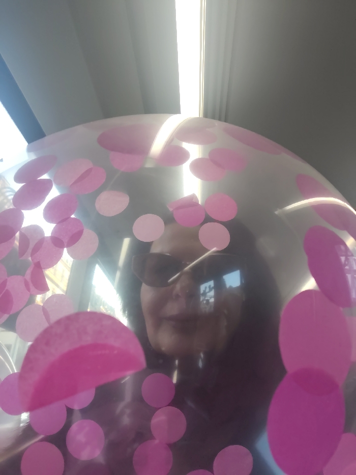 - "The image depicts a close-up, upward-angled view of an adult individual partially obscured by a large, transparent balloon filled with numerous bright pink circular confetti pieces" by FM-Odse83, licensed under CC BY 4.0