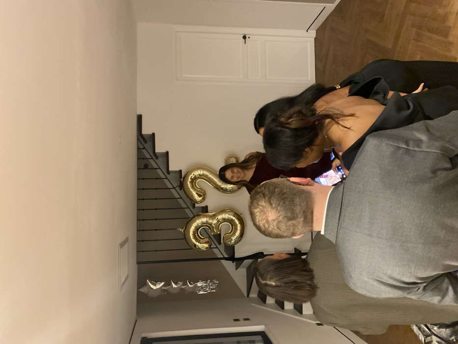 A group of people are gathered on a staircase decorated with gold foil balloons that form the number "23." A woman in a maroon top stands beside the balloons and smiles. Another woman, wearing a black dress, looks at a phone screen. Two men are also present; one wears a gray suit and the other wears a green coat. The location appears to be inside a house with wooden floors, a white door, and a staircase with black railings. Silver star-shaped balloons are near the bottom of the staircase.