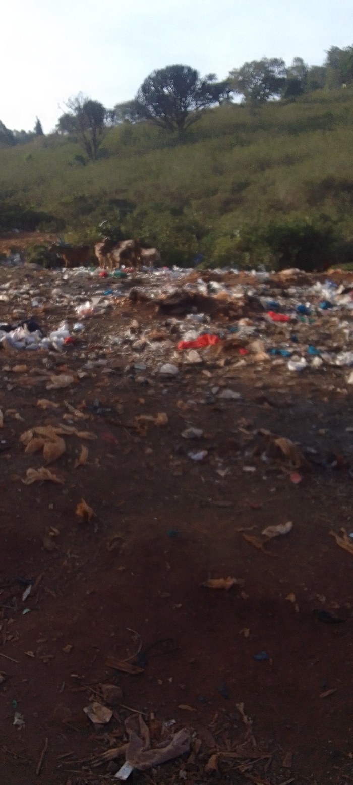 The image displays an outdoor landfill or informal dumping site located in Ngong ward, Kenya