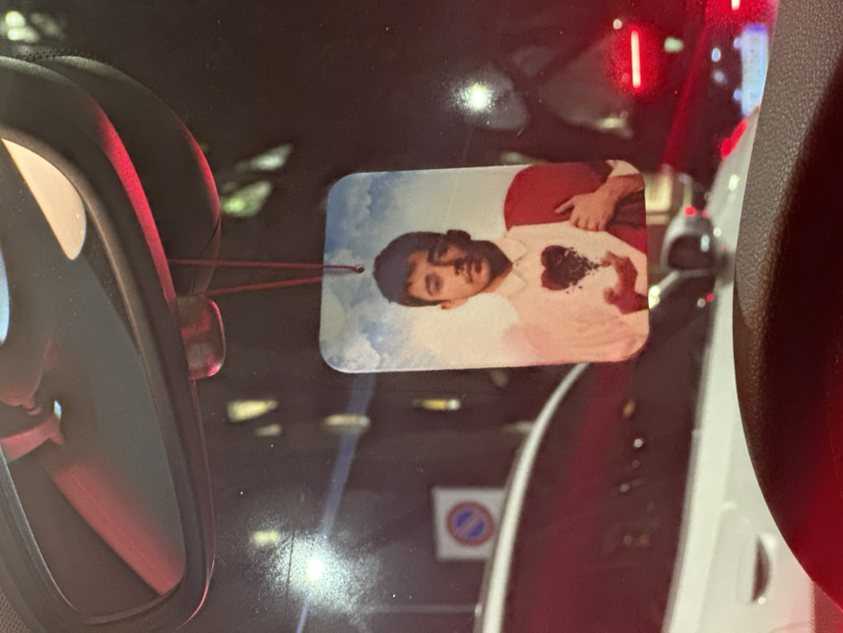 A rectangular car air freshener hangs from a car's rearview mirror. It features a man with dark hair, wearing a white shirt with a red collar, stained with a dark heart shape. The freshener has a blue, cloudy background. Outside the car window, a white vehicle and traffic signs are visible, reflecting on the dashboard. Part of the car's interior is also in view, including the rearview mirror.