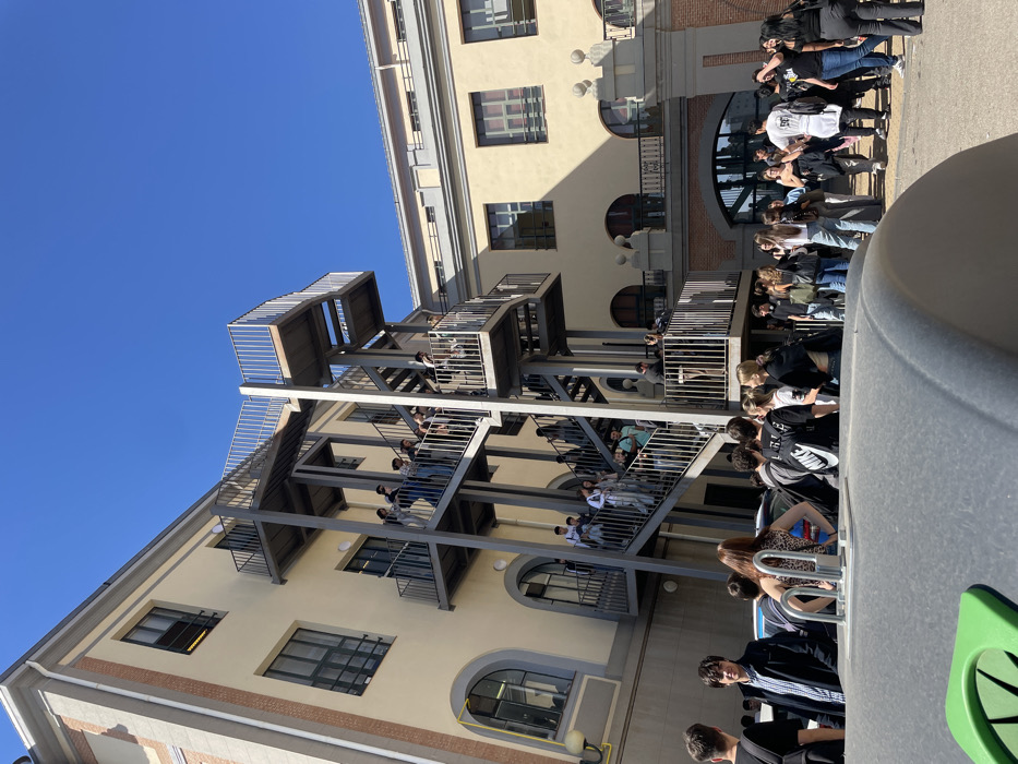 The image displays an exterior view of the Universidad Rey Juan Carlos (URJC), Campus de Vicálvaro, situated in Madrid, Spain. The scene is bathed in daylight under a clear, cloudless blue sky. The primary subject is a multi-story building featuring light yellow stucco walls, dark-framed windows, and sections with red brick detailing. A prominent, multi-tiered external staircase, constructed from grey metal with open treads and railings, is affixed to the left facade of this building. Numerous individuals, predominantly young adults, populate the environment. Approximately 30-40 individuals are distributed across the various landings and steps of the external staircase, some standing, others in motion. An additional group of approximately 20-30 individuals congregates on the paved courtyard directly in front of the building. All individuals are dressed in casual attire, consistent with student populations, including t-shirts, hoodies, and jeans; many carry backpacks. In the immediate lower center foreground, a dark grey plastic waste bin, featuring a green fan-shaped aperture on its lid, is partially visible, obscuring the lower portions of some individuals on the ground level. The overall scene depicts a busy campus environment.