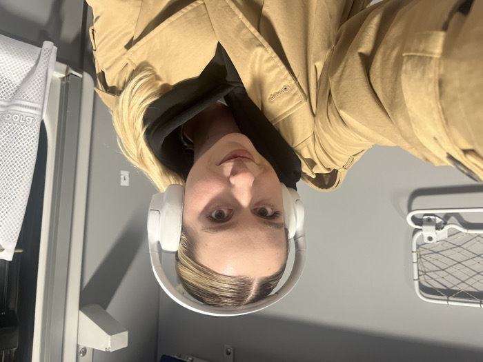 A young adult female is shown in a close-up selfie-style photograph, positioned inside what appears to be a train compartment in Minsk, Belarus. She has light skin, blonde hair parted in the center and tied back, and is wearing white over-ear headphones. Her attire includes a black hooded sweatshirt under a light tan trench coat. She looks directly at the camera with a slight, closed-lip smile, holding the camera device with her partially visible right arm. The background consists of plain light gray walls. To the left, a white metal grid-like luggage rack is mounted on the wall. To the right, a vertical white panel or doorframe is visible, from which a white mesh bag, possibly a laundry bag, is suspended. Faint white lettering is discernible on the bag's surface. Above the bag, a white rectangular support bracket protrudes from the wall. The interior structure is consistent with public transportation, specifically a train carriage.