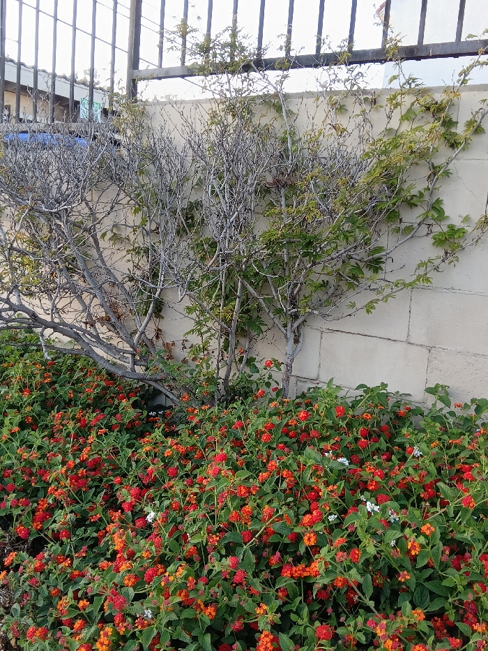 The scene depicts an outdoor environment in East Los Angeles, United States. In the foreground, a dense bed of flowering plants, primarily Lantana, exhibits clusters of red and orange blossoms mixed with occasional white-yellow flowers and green foliage. Behind this floral bed, two multi-trunked shrubs or small trees are positioned against a light beige concrete block wall. The left shrub is largely deciduous with bare, grayish branches, while the right shrub displays green leaves and some climbing vines ascending the wall. The wall itself shows distinct block lines. Above the wall, a dark metal security fence with vertical bars is visible, extending across the upper portion of the image. In the background, beyond the fence and wall, a light-colored building structure is partially visible, along with a blue object and faint, illegible graffiti on a distant surface. The sky appears bright but overcast. No individuals, overt actions, or interactions are present in the image.