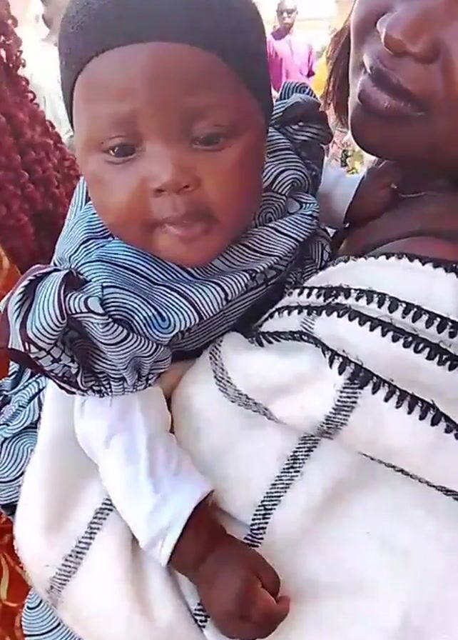 A woman holds a baby in her arms. The baby wears a black beanie, a blue and white patterned blanket, and a white shirt. The woman wears a white shawl with black stitching. The baby stares directly at the camera, occasionally sticking its tongue out. The woman looks at the baby and smiles. There are several people in the background. The setting appears to be outdoors.
