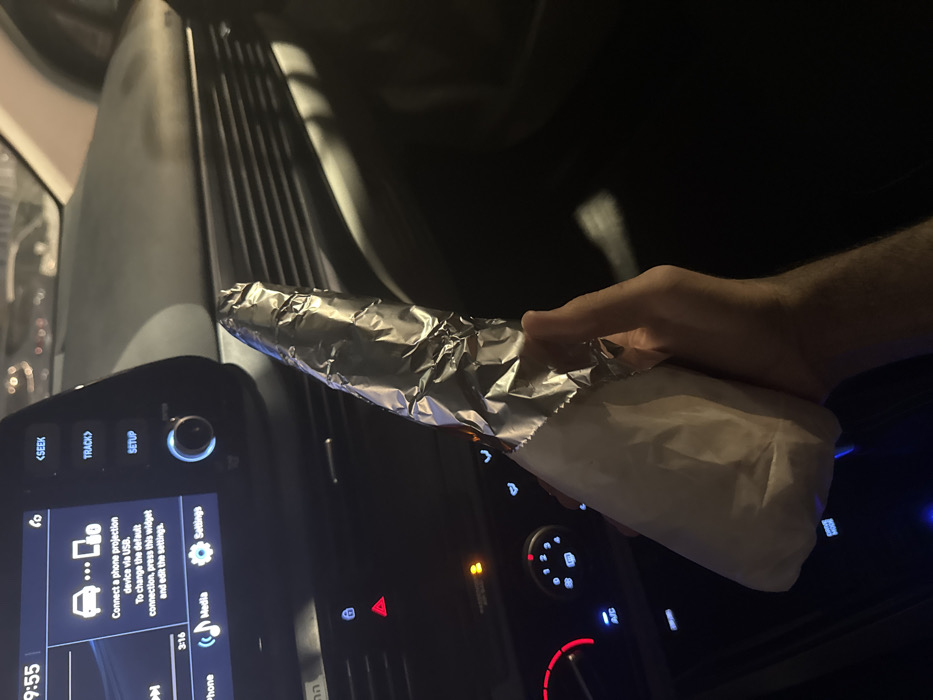 The image depicts the interior of a modern vehicle at night, consistent with the city of Afula, Israel, based on the presence of Hebrew text on the infotainment system. A single adult right hand, positioned in the lower-center of the frame, holds a conical food item wrapped in white paper on the lower portion and silver aluminum foil on the upper portion. The vehicle's dashboard is dark-toned, featuring a prominent infotainment screen displaying "9:55" and a message regarding USB phone projection, along with Hebrew text. Below the screen, the control panel is illuminated with blue, red (hazard light button), and orange (indicator light) lights, including a dial with numerical settings. Horizontal air vents are visible on the dashboard to the right of the central console. Blurred lights in the background, visible through the windshield, indicate an outdoor urban or parking lot environment at night.