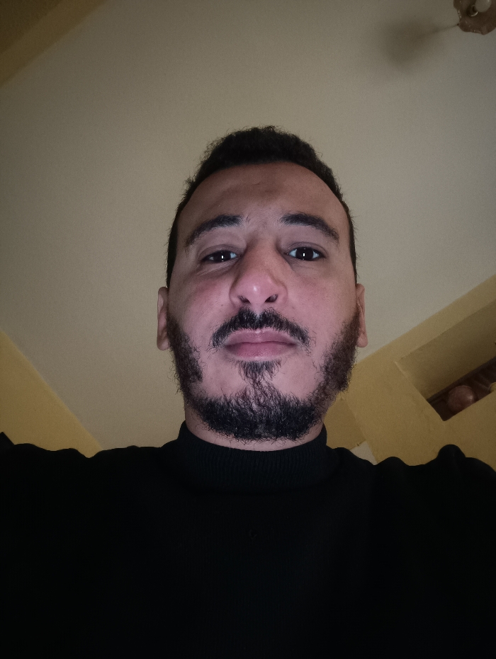 An adult male is depicted in a close-up, low-angle indoor portrait. He possesses dark hair, a trimmed dark beard, and a mustache, and wears a black turtleneck garment. His gaze is directed forward, directly at the camera, with a neutral facial expression. The background consists of plain, light beige-colored walls and a ceiling. A partial, simple ceiling light fixture is visible in the upper right quadrant of the image. Below and to the right of the subject, a darker, yellowish section of a wall or structural element is present, partially revealing a recessed area or shelf containing unidentifiable objects. The scene is situated indoors, within the city of Meknes, Morocco.
