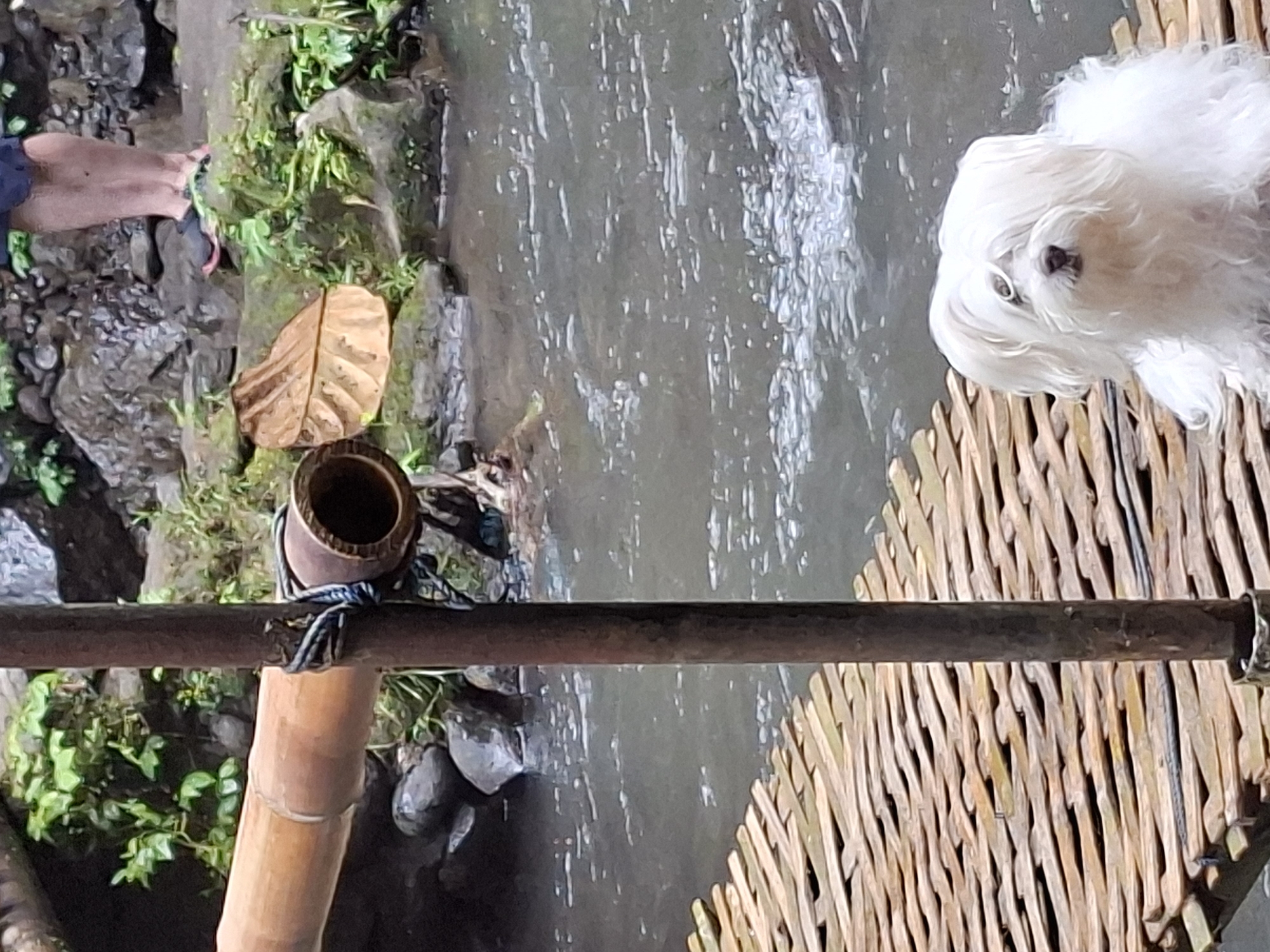 The image depicts a stream in Petang, Indonesia, observed from a vantage point above the water, likely a bridge or elevated platform. A section of a footbridge, constructed from bamboo and other natural materials, is visible, including the woven surface and a bamboo railing tied with blue rope. A small, white dog with long fur stands on the bridge, facing away from the camera. To the left, on the bank of the stream, there's a glimpse of a foot with red sandals, suggesting a person is present. Vegetation, including greenery and a fallen leaf, is visible on the rocky stream bank. The stream itself is a gray color, and the light conditions indicate it is daytime.