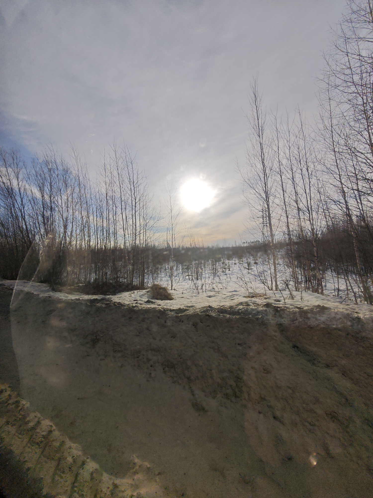 The image depicts a snow-covered landscape under a bright, overcast sky with the sun visible through the clouds. The scene is bordered by bare trees and brush. A dirt or snow bank is in the foreground, partially obstructing the view of the landscape. The location is presumed to be Unknown, Russia. There are no people visible in the image.