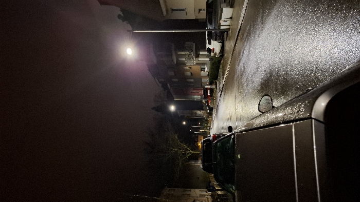 A nighttime street scene features a wet road reflecting light. Buildings line one side, illuminated by street lamps casting a glow through the fog. Cars are parked along the curb, with one prominently in the foreground, droplets covering its surface. The atmosphere is dark and damp, suggesting a rainy night.