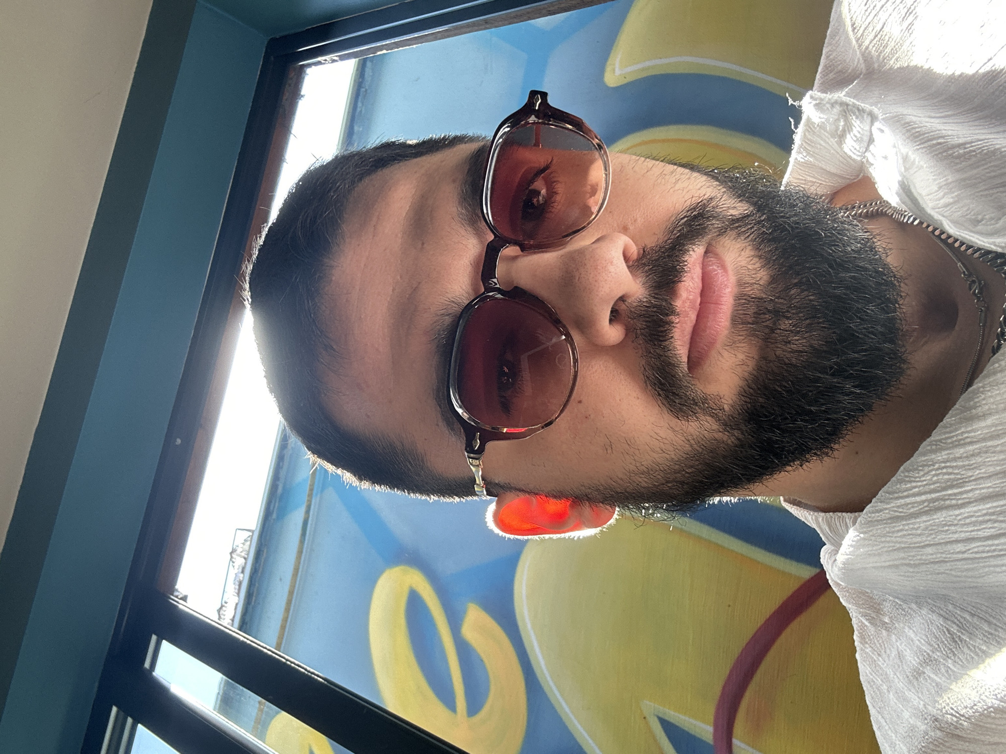 The image is a close-up selfie of a man with a dark beard and sunglasses