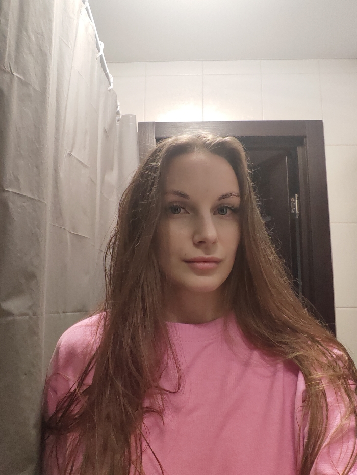 A female subject is centrally depicted in a head-and-shoulders portrait within an indoor residential setting, specifically a bathroom, in the city of Unknown, Unknown. The subject has long, light brown hair, light-colored eyes, and a neutral expression, gazing directly at the camera. She is wearing a light pink, long-sleeved crew-neck garment. To the left, a light-colored, vertically pleated shower curtain with white suspension rings is partially visible. To the right, a dark brown door frame is present, enclosing a partially open dark door with a visible silver hinge. The upper background consists of white square wall tiles. The scene is illuminated by overhead artificial lighting.
