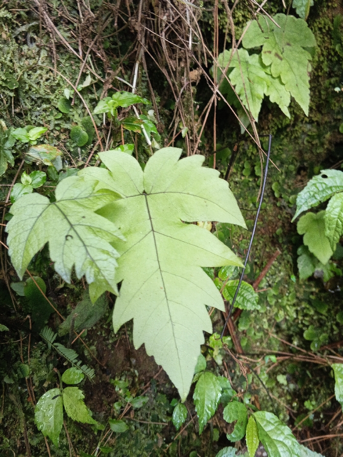 The image displays a close-up, static scene of dense vegetation on a natural surface in Desa Mburukulu, Indonesia. No human subjects, animals, or artificial structures are visible. The central and dominant subjects are two large, light green leaves with distinct dark venation; the larger leaf, positioned centrally, exhibits a multi-lobed, deeply serrated structure, while a smaller, similarly shaped leaf is partially visible to its left. The entire background consists of a textured, verdant matrix of smaller green plant life, including various mosses and leafy growths, some appearing wet. Numerous thin, dry, brown twigs are interwoven in the upper section of the background. A dark, slender, curvilinear element, resembling a wire or a rigid stem, extends from the upper right quadrant, diagonally crossing behind the central large leaf and descending towards the lower-middle portion of the frame. The overall environment is characterized by lush, damp, and undisturbed natural growth.
