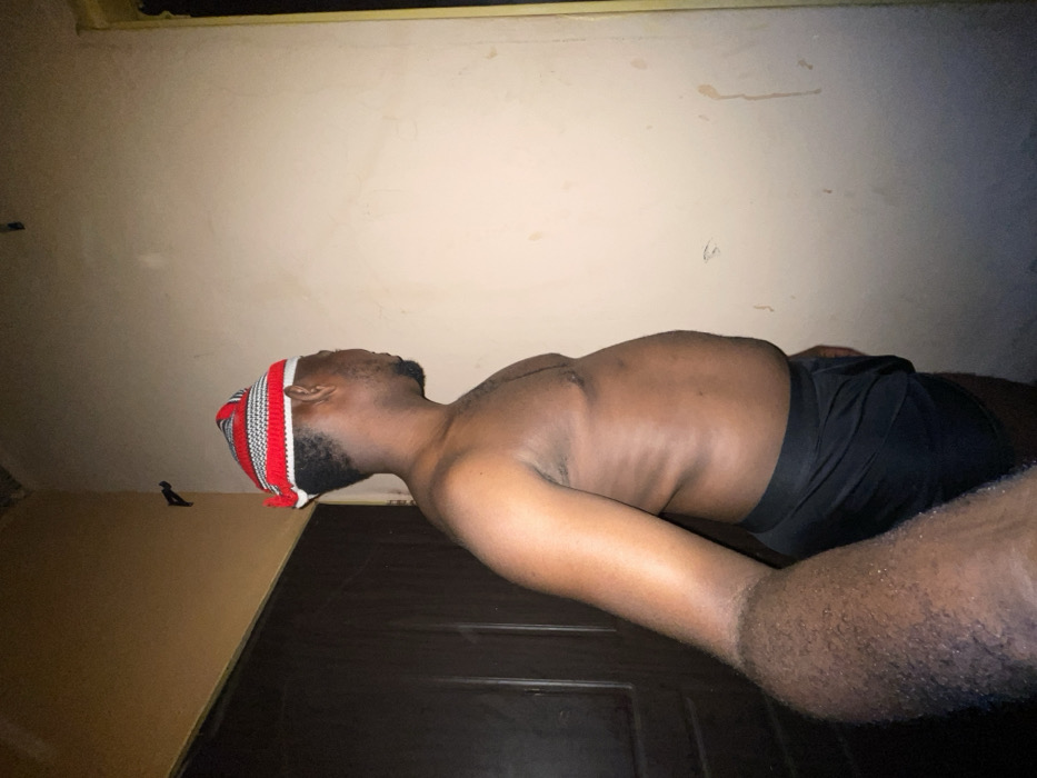 In Unguwar Gabas, Nigeria, a shirtless adult male is depicted in a medium shot, viewed in profile from the right. He wears black boxer briefs and a knitted cap featuring red, white, and black stripes. His right arm, prominently featured and appearing textured, extends into the foreground from the lower-left, indicating the individual is likely holding the camera for a self-portrait. The background comprises a light-colored, possibly beige, wall with visible stains and discoloration towards the right side. To the left, a dark brown door or door frame is partially visible. A small, dark, hook-like fixture is mounted on the upper-left portion of the light-colored wall. The scene is illuminated by ambient, somewhat dim lighting.