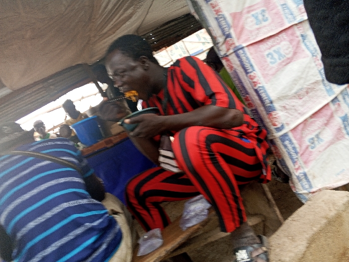 A man in red and black striped clothes squats and eats from a small bowl. He sits near a stack of Dangote cement bags under a makeshift shelter with a corrugated metal roof. Another person in a blue and white striped shirt is partially visible to the left. The setting appears to be an outdoor market or gathering place.