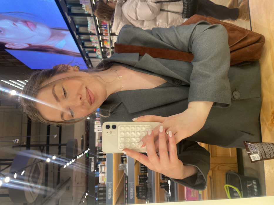 The image displays a mirror selfie taken inside a retail store specializing in beauty and cosmetic products, identified by "PROMAKEUP" branding, located in the city of Kommunarka, Russia. The primary subject is a young adult female, depicted from the chest up. She has light skin, light brown hair styled upwards, and wears a dark grey blazer over a matching dark grey waistcoat. A small gold stud earring is visible on her right ear, and a delicate gold necklace with multiple small bar pendants adorns her neck. Her fingernails are manicured with a light-colored, possibly glittery, polish, and she wears a gold-toned ring on her right ring finger. A brown, suede-like shoulder bag hangs from her right shoulder. She holds a light-colored iPhone, equipped with a "pop-it" style case, with both hands to capture her reflection, and she exhibits a faint smile while looking downwards towards the phone. The background, visible through the mirror's reflection, depicts a well-lit retail space. Display shelves stocked with various beauty and cosmetic products in bottles and containers are prominent, featuring "PROMAKEUP" signage. A large digital screen on the upper right displays a close-up image of a person's face, indicative of an advertisement. A second individual, wearing a white puffer coat, is partially visible in the reflection on the right, facing away from the camera and seemingly browsing products. In the lower foreground, a light-colored countertop is visible, hosting a small, dark-colored product pouch with white text. A green and black shopping basket is partially visible on the extreme left.