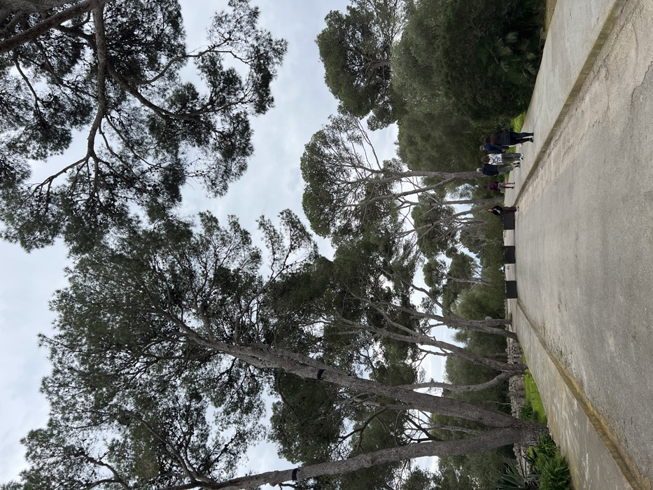 The image displays an outdoor pathway in Manacor, Spain, under an overcast sky. A light-colored, possibly paved or gravel road extends from the foreground into the background, bordered by elevated concrete sidewalks on both sides. Tall, slender pine trees with dark green needle-like foliage line the path, forming a canopy that frames the cloudy, grey sky above. Some tree trunks feature dark bands. To the left of the pathway, a low stone wall is visible, accompanied by various green plants including succulents. To the right, a dense array of green bushes and smaller trees, including palm-like plants, forms a natural border. Midway down the path, four dark, rectangular objects, consistent with barriers or large planters, are positioned horizontally across the main thoroughfare. A group of six individuals is observed walking away from the viewer on the right-hand sidewalk. The individuals are dressed in casual attire and are proceeding in the same direction along the path.