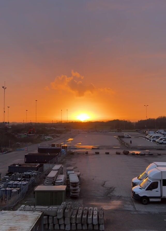 vibrant sunset over an industrial or commercial area. The sky is a mix of deep orange and purple, with the sun setting on the horizon behind a line of trees. The foreground is an empty parking lot with puddles reflecting the colors of the sunset. There are several parked white vans on the right side of the lot. On the left, there are containers, building materials, and construction equipment. Several tall light poles are visible throughout the scene. The overall atmosphere is peaceful, highlighting the natural beauty of the sunset against an industrial backdrop.
