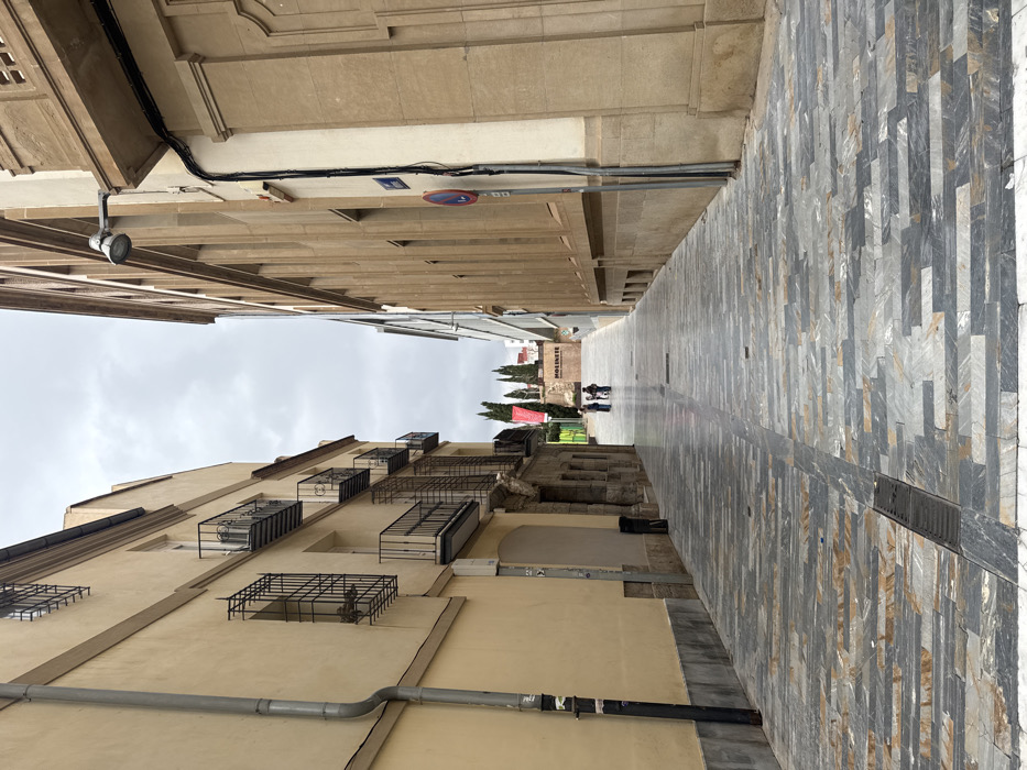 The image depicts a narrow paved street in Barriada De Villalba, Spain, under an overcast sky. The perspective looks uphill, tapering towards a distant open area. On the left, a multi-story building with a light beige facade features multiple windows, some with decorative black metal grilles, and several small black metal balconies. A grey metal downspout runs vertically along the left wall. A black trash receptacle is visible near the base of this building towards the middle distance. On the right, a multi-story building with a light brown/tan, possibly stone, facade exhibits strong vertical architectural elements and recessed windows. A grey streetlamp extends horizontally from this building at mid-height in the foreground. Below it, a black pole holds a blue rectangular street sign and a red circular "no parking/stopping" sign. Electrical conduits are also visible on this wall. The street is paved with rectangular stone slabs in varying shades of grey, blue, and brown, arranged in a horizontal, staggered pattern. A dark grey linear drainage grate runs down the center of the street in the foreground. The paving appears slightly wet, reflecting the dull light. In the mid-ground, towards the top of the incline, three individuals are visible: two adults and one child, standing in conversation near the center of the street. Beyond them, a small group of tall, slender evergreen trees (likely cypress) stands prominently. Architectural elements and what appears to be a red banner or structure are visible in the background, along with a white sign displaying the word "MOLINETE". The overall impression is a quiet urban environment with a blend of older and potentially newer architectural styles.