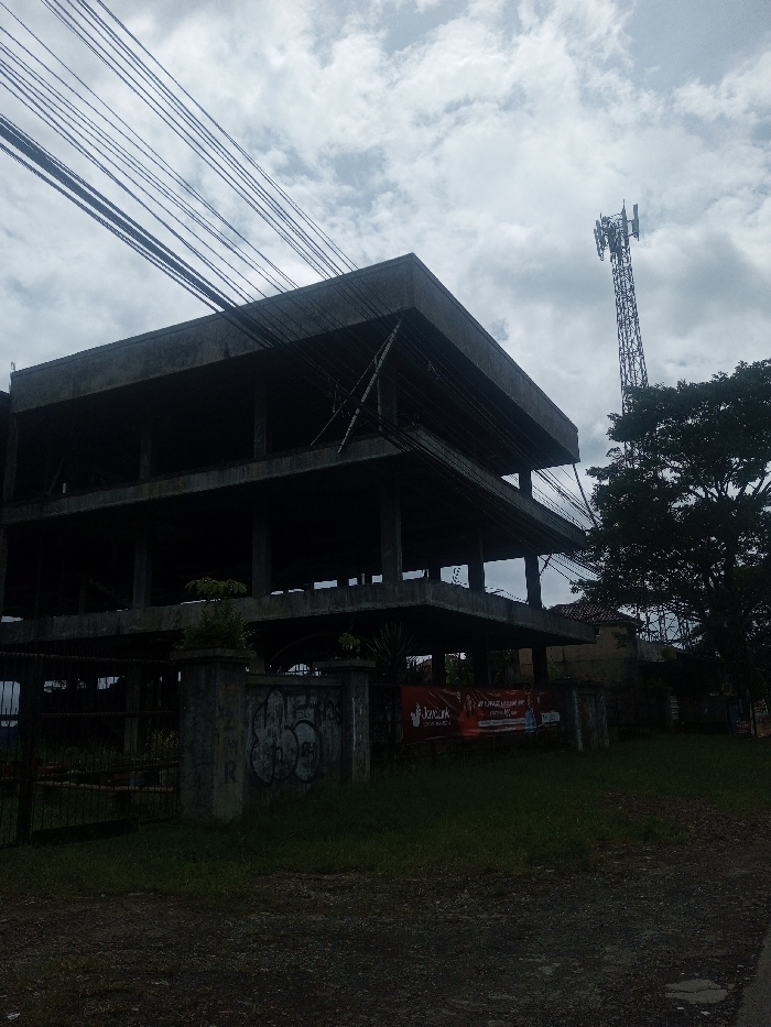 The image depicts an outdoor scene in Sarwahi Mal., India, under an overcast sky dominated by white and grey clouds. The primary subject is a dark, three-story, unfinished concrete building shell positioned prominently in the mid-ground, featuring exposed structural elements and open floor levels without walls or windows. Numerous black utility wires are strung diagonally across the upper left portion of the frame, passing above the building. To the right of the building, a tall, grey metal lattice telecommunication tower with multiple antennas extends upwards, partially obscured by the dark green foliage of a large tree. In the foreground, a patch of vibrant green grass precedes a darker dirt or gravel path. A low concrete wall or fence, marked with light-colored graffiti, spans the mid-ground in front of the building, with an open metal gate visible to its left. A red banner with white text, partially legible as "Jogja" and other words, is affixed to the right section of the concrete wall. No individuals are visible in the frame.