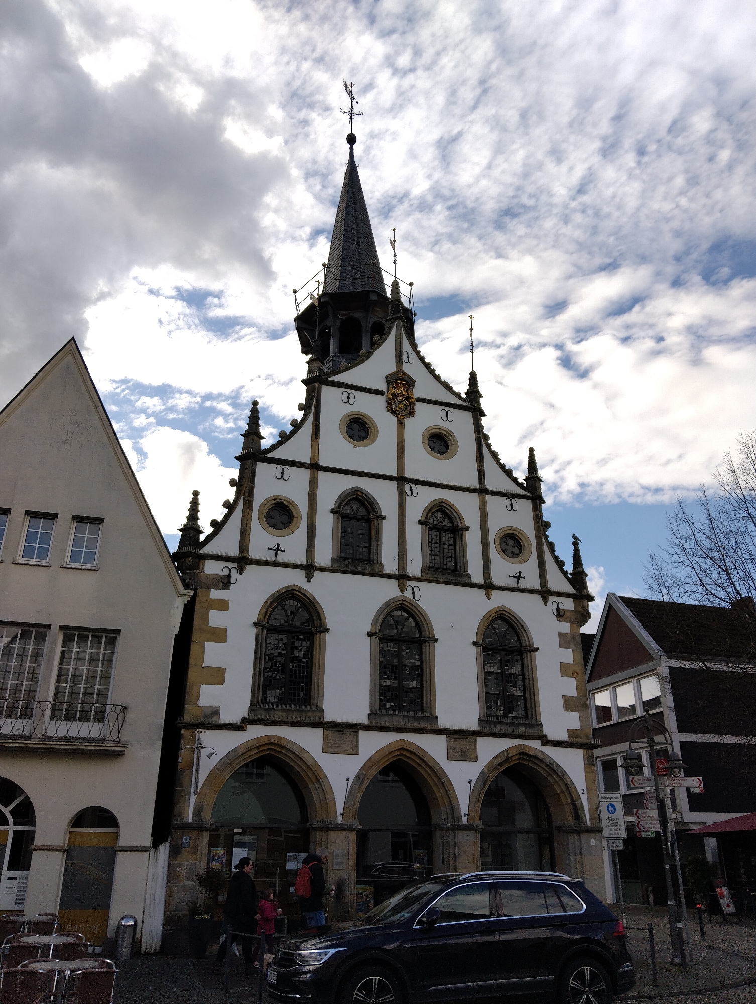 An external view of the historic Rathaus (Town Hall) in Burgsteinfurt, Germany, is depicted under a partly cloudy sky. The multi-story central building features a white facade with dark stone and trim accents, characterized by a prominent stepped gable with decorative finials. A steep, dark conical spire, topped with a weathervane (featuring a cardinal direction indicator and an animal figure), rises from the roofline. The facade displays a golden coat of arms or emblem on its upper section, along with several arched windows on the lower levels and circular windows on the upper levels, all with dark frames. Bird-deterrent spikes are visible along ledges. The ground floor exhibits multiple large stone arches. To the left, an adjacent light-colored stucco building with a simpler gable roof features multiple rectangular windows and a second-story balcony with an ornate dark metal railing. Outdoor cafe-style tables and chairs are positioned in the foreground near this building. To the right, a darker building with a visible reddish-brown roof and white-framed windows is partially observed. A dark street pole with multiple white and red directional signs, including one for "Fußgängerzone" (pedestrian zone) and town names such as "Horstmar," stands near this building. A red umbrella from an outdoor seating area is also partially visible. At street level, a dark-colored SUV is parked parallel to the curb in front of the Rathaus. Several individuals are present on the paved surface near the Rathaus entrance. This includes an adult dressed in dark clothing walking alongside a child in a pink jacket, and another adult carrying a red backpack. The ground surface appears to be paved. Bare tree branches are visible on the far right, suggesting a late autumn or winter season.