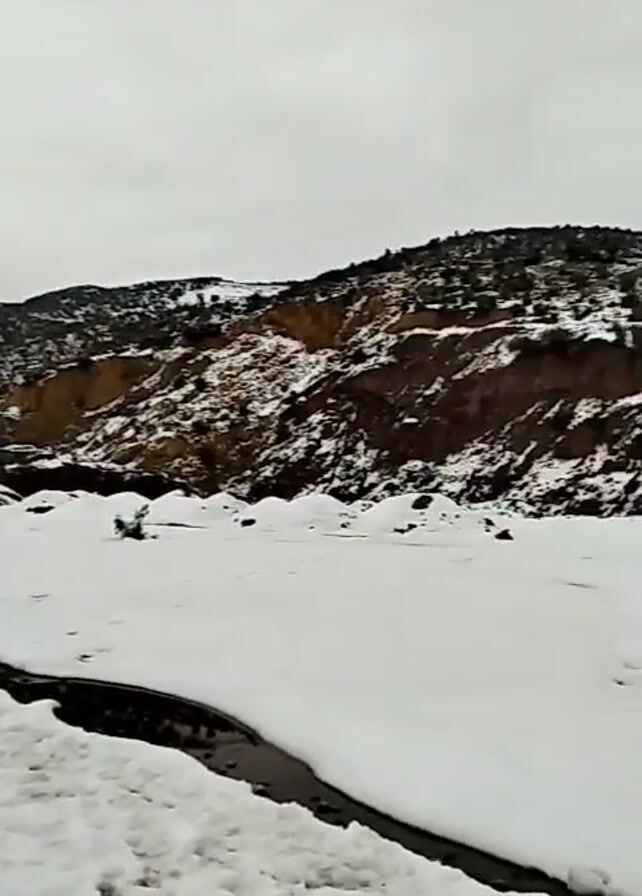 The video showcases a landscape covered in snow, with mountains visible in the distance under a cloudy sky. Patches of exposed land or water can be seen interspersed within the snowy terrain. The camera pans across the scene, revealing a road partially covered in snow, with a metal guardrail alongside it. The landscape features a mix of snowy fields and rocky, vegetation-dotted hillsides. The overall atmosphere is cold and serene, marked by the pervasive presence of snow and the muted tones of the winter environment.