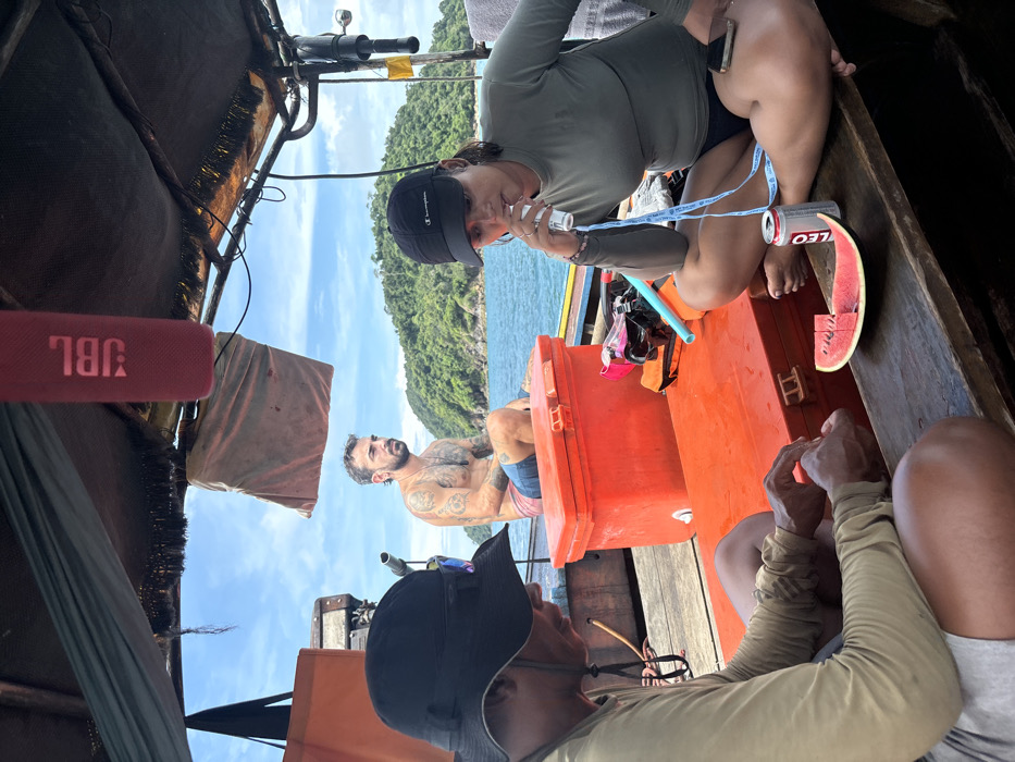 Three individuals are depicted on a wooden longtail boat in the waters near Ko Tarutao, Thailand, under a clear blue sky with some scattered clouds