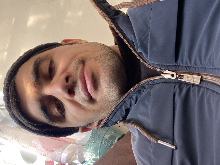 A man with light skin, wearing a black beanie, looks directly at the camera with a slight smile. His face has stubble, and his eyes are dark. He is wearing a blue zippered jacket with brown trim and metallic toggles on the drawstrings. The background is out of focus, but shows light and possible floral patterns. The image is oriented vertically and rotated slightly.