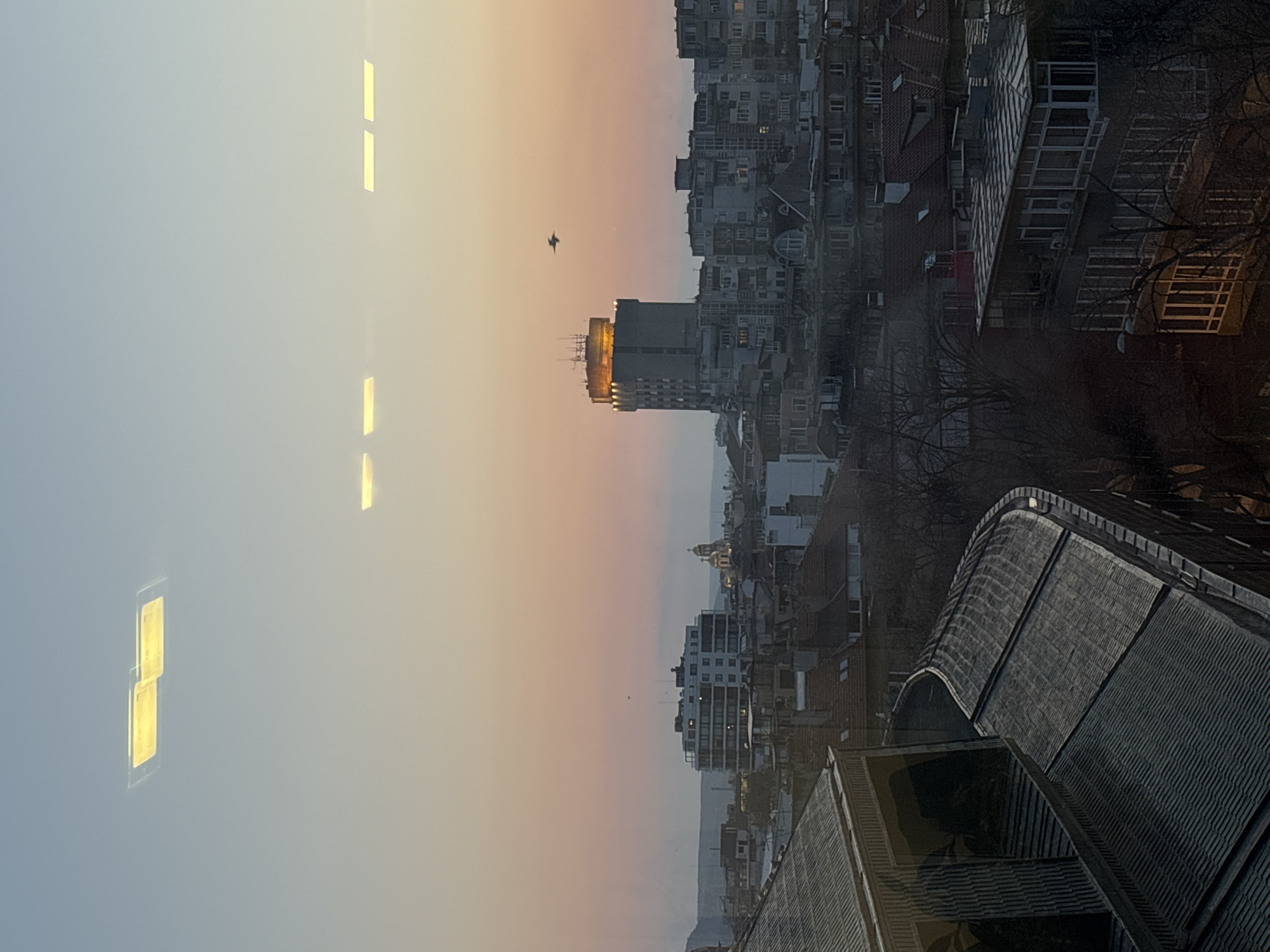 The scene depicts an elevated urban vista of Varna, Bulgaria, captured during either sunrise or sunset. The sky exhibits a gradient from pale blue at the zenith to orange and pink hues along the horizon. Two distinct, bright yellow, rectangular light reflections are present in the upper-left sky quadrant, originating from an internal light source reflecting off the viewing glass. A solitary dark bird is captured in mid-flight in the upper-right quadrant of the sky. The central feature on the distant horizon is a prominent, multi-story building, identifiable as the Oborishte hotel (also known as the old Shipka hotel), characterized by its brightly illuminated golden-yellow upper section. To its left, a smaller structure with a golden church dome, characteristic of the Dormition of the Theotokos Cathedral, rises above the surrounding city structures. Further left in the mid-ground, a modern white building with curved architectural elements and numerous windows is visible. The immediate foreground is occupied by a large, dark, curved roof structure with a distinct textured, scale-like tile pattern. The urban landscape comprises a dense arrangement of diverse residential and commercial buildings, predominantly multi-story, with visible rooftops, balconies, and numerous windows, some of which display interior illumination. Patches of bare deciduous trees are interspersed throughout the urban environment, indicating a winter or early spring season. Distant landforms are faintly discernible as a muted line along the far horizon.