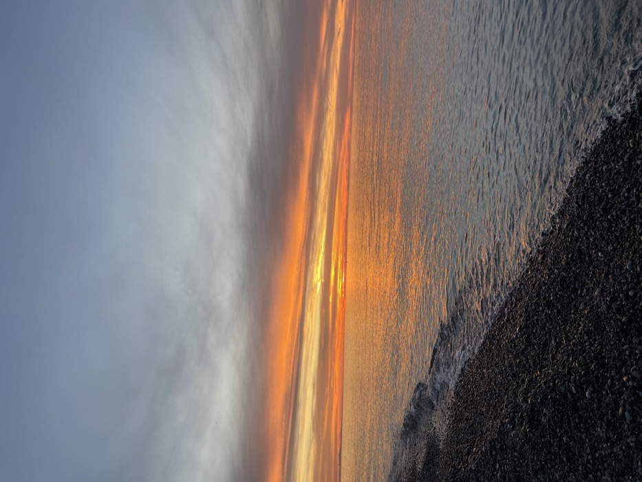 The image depicts a sunset over the Black Sea coastline in Batumi, Georgia. The upper portion of the frame shows a sky gradient, transitioning from a light blue-grey at the top to vibrant horizontal bands of orange, red, and yellow near the horizon, indicative of a sunset. Diffuse, elongated clouds are present, illuminated by the setting sun. The sun's disc, appearing as a bright orange-yellow, is positioned low on the horizon towards the left side of the frame. The majority of the lower half of the image consists of the sea, which reflects the vivid colors of the sky, creating a shimmering expanse of orange and yellow water. In the foreground, a dark grey pebble beach extends diagonally from the lower-left corner towards the center-right, with small, white-foamed waves gently breaking along the shoreline. No individuals, objects other than natural elements, or discernible actions are present within the scene.