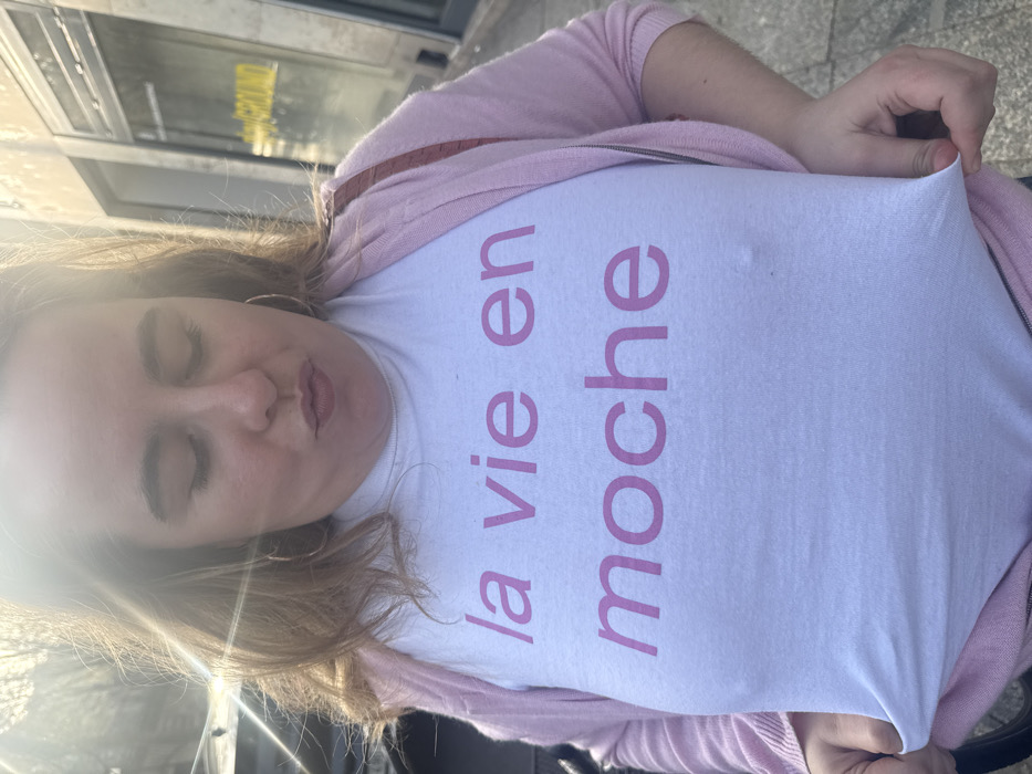 The image displays a woman outdoors in a city setting, identified as Unknown, Unknown. She is depicted from the chest up, with light-colored hair and hoop earrings. Her eyes are closed or looking downwards, and her lips are puckered. She wears a white t-shirt with the pink text "la vie en moche" and a light pink zippered cardigan over it. Her hands are visible at the bottom of the frame, pulling the t-shirt fabric taut, which reveals the outline of her nipples. The background features a partial view of a dark vehicle on the left and a building facade with dark windows on the right, where faint yellow text, possibly "GROUND," is visible. Strong sunlight from the upper left illuminates the scene, causing a lens flare. The ground appears to be paved.