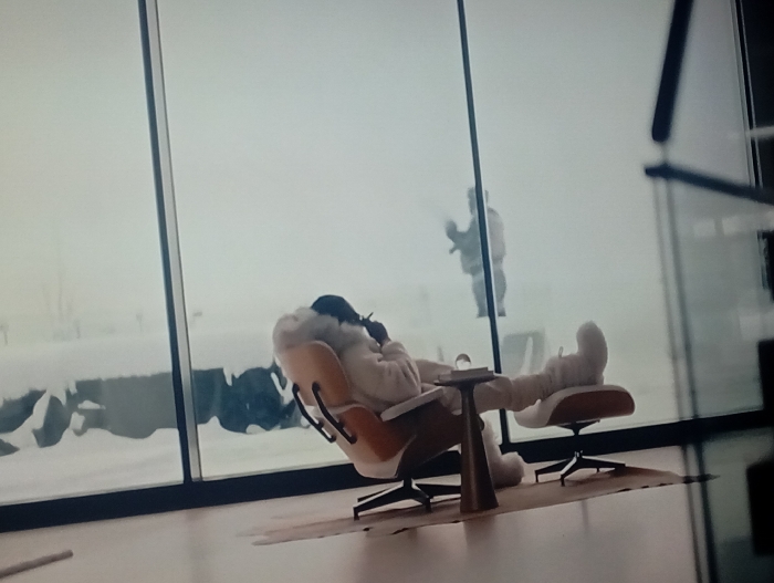 A person in a white furry outfit sits in an orange and white chair with a matching ottoman, seemingly relaxed with legs up. A small round table with an object on it stands beside the chair. Through the large windows, a snowy landscape is visible. In the distance, a figure stands amidst the snow, possibly holding an object or tool. The room appears modern with sleek lines and sparse decor.