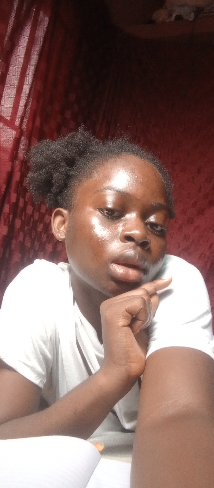 The image presents a chest-up portrait of a dark-skinned individual, appearing to be a young adult female, located indoors in the city of Unknown, Unknown
