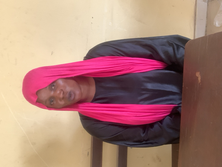 An adult female, approximately 30-40 years old, with dark skin, is depicted seated in an indoor setting. She is wearing a bright pink head covering that drapes over her shoulders and a long-sleeved black garment. Her mouth is slightly open, indicating an utterance or speech in progress. A dark wooden table occupies the lower portion of the frame, in front of the subject. The background consists of a plain, light-colored wall, likely tan or yellow, with a dark horizontal structural element visible behind her left shoulder. The scene is located in Abobo, Nigeria.