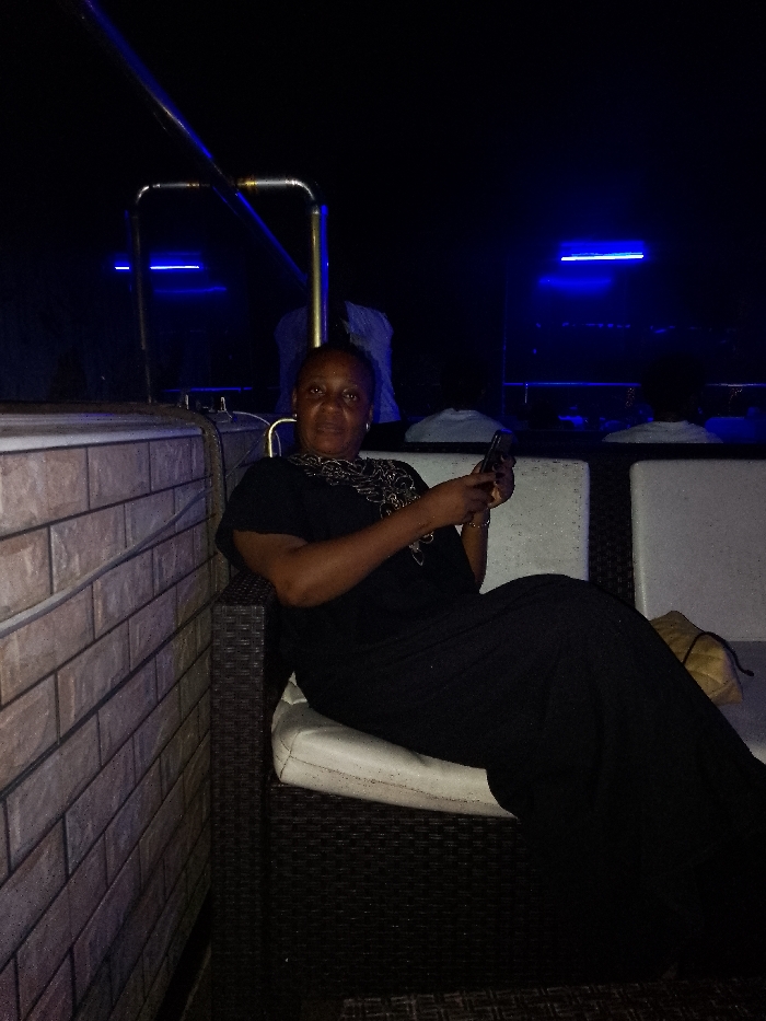 A middle-aged woman sits on a patio chair, holding a smartphone. She wears a black dress with intricate detailing around the neckline and a wristwatch on her right wrist. The background is dimly lit, with blue lighting accentuating the dark surroundings. A brick wall is on the left, and a metal rail is above her, adding to the outdoor ambiance. In the background, blurry figures are visible on the right.