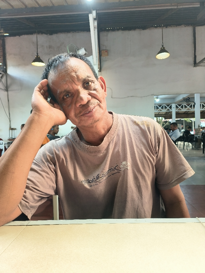 An image taken in Lhokseumawe, Indonesia, depicts a middle-aged male individual seated at a light-colored table or counter within what appears to be an indoor or semi-open dining establishment
