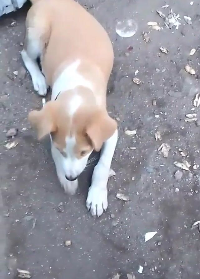- "A dog with a white and tan coat lies on a rough, grey surface, possibly concrete or compacted dirt" by FM-MrJfz1, licensed under CC BY 4.0