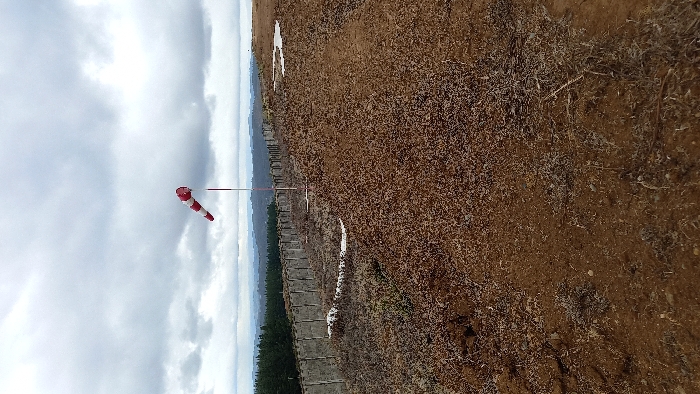 An outdoor scene under a cloudy sky shows a windsack flapping, indicating wind direction. The landscape features a barren, brown terrain with sparse vegetation, possibly a field or open ground. In the distance, there is a line of trees or a forest edge. A low wall or barrier runs parallel to the trees, adding a sense of demarcation. The weather appears overcast.