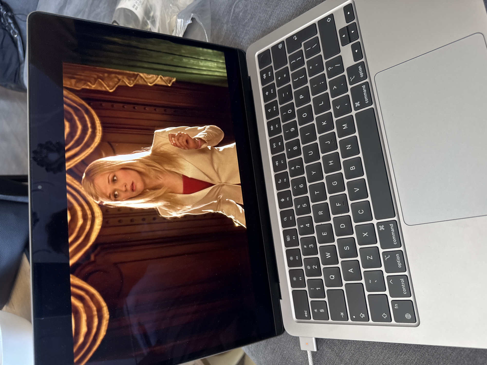 The image depicts an open Macbook laptop. The screen shows a scene featuring a blonde woman in a white jacket and a red top, appearing to be part of a movie or TV show set with ornate golden decorations. The keyboard and trackpad of the laptop are clearly visible. The environment is a grey surface, possibly a couch or chair, with other items like plastic bags and other objects in the background. The laptop appears to be charging as a cable is plugged into its side.