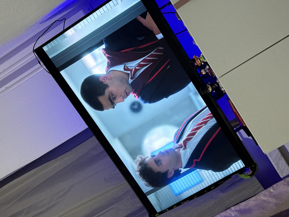 A flat-screen television is prominently displayed, tilted diagonally in the frame, against a textured white wall illuminated by a purple LED strip, creating ambient backlighting. To the immediate left of the television, a light-colored curtain or fabric hangs. The television screen shows a scene with two young men, both appearing to be in their late teens or early twenties, dressed in dark blazers with red trim, white shirts, and red and white striped ties, consistent with school or academy uniforms. The man on the right has dark, short hair and is looking downwards and to the left, his hands possibly crossed. The man on the left has brown, wavy hair and is looking upwards and to the right, towards the other man, with a serious expression. The on-screen background features a bright, indoor setting with a large circular light source and a blue-lit vertical panel. Below the television, resting on a white cabinet, several small figurines are visible, including one with a yellow 'M' logo, a blue figure, and other colorful, indistinct characters. The specific location within the city of Dresden, Germany, cannot be determined from the provided image.