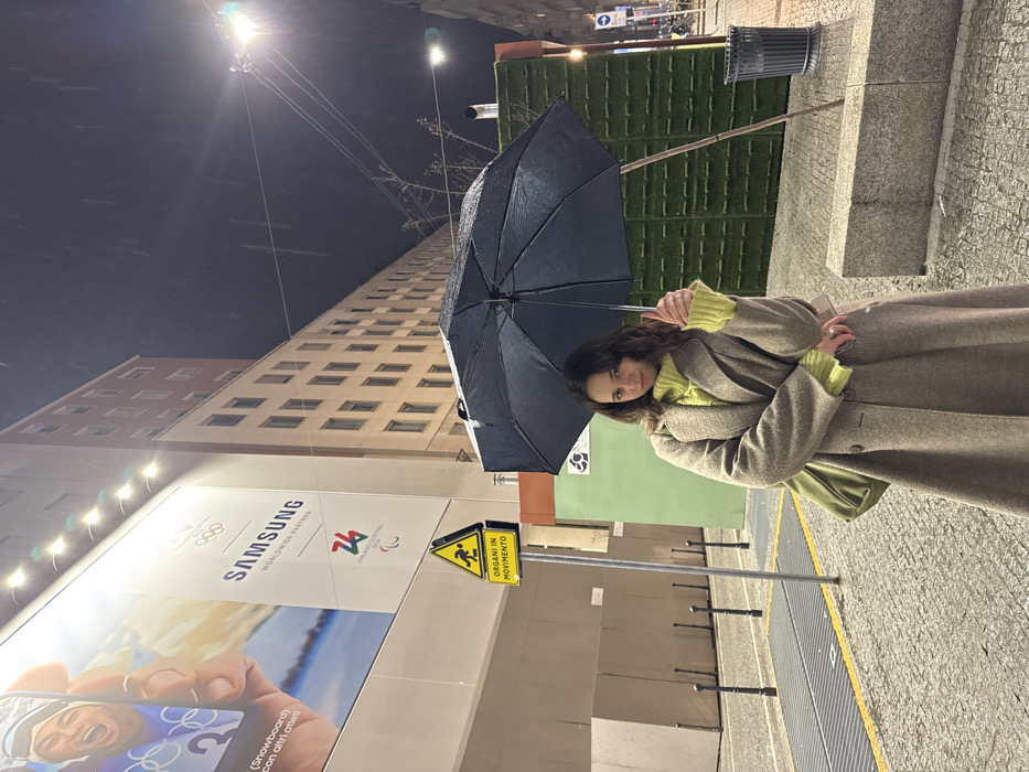 A woman stands under a black umbrella on a city street during a light snowfall at night. She wears a tan coat and a bright yellow-green sweater. Behind her is a tall building with many windows. A large Samsung advertisement, featuring the Olympics logo, is on a building adjacent to the one with windows. A yellow warning sign with a graphic of a person running is also visible. The street is paved with cobblestone and has metal railings.